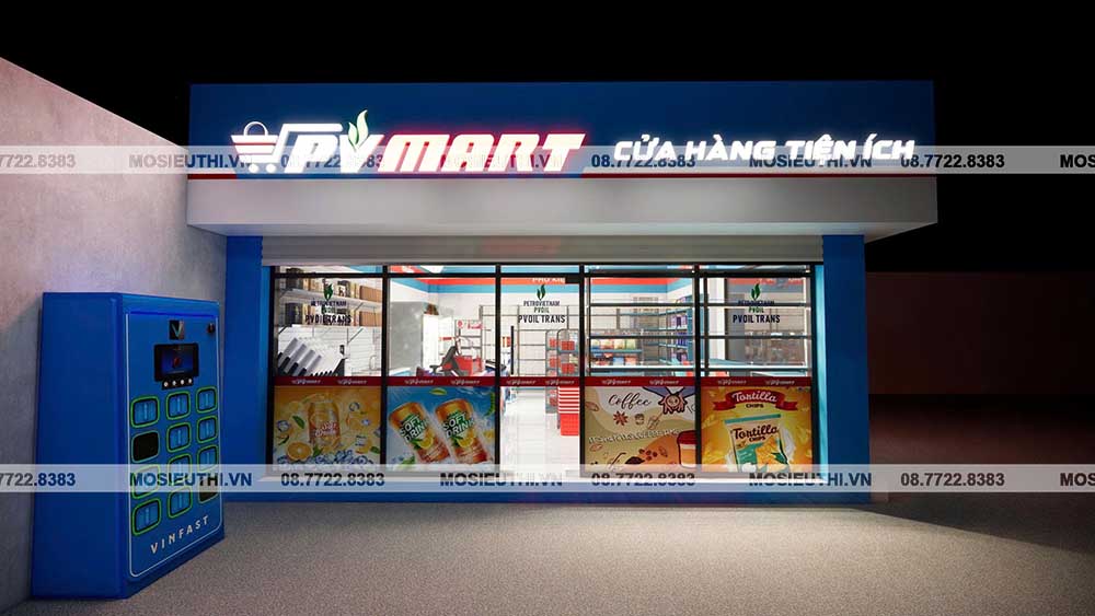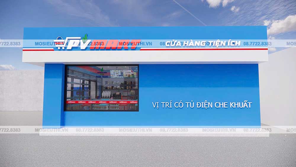 Một ưu điểm lớn của thiết kế 3D là giúp chủ đầu tư thấy rõ hình ảnh cửa hàng trong tương lai, từ tổng thể đến chi tiết. Với PV Mart, bản thiết kế thể hiện đầy đủ: