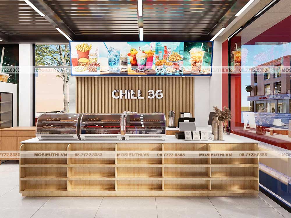 Một ưu điểm lớn của thiết kế 3D trong dự án setup trọn gói là giúp chủ đầu tư nhìn thấy trước cửa hàng của mình khi hoàn thiện. Với Chill 36, bản thiết kế thể hiện rõ: