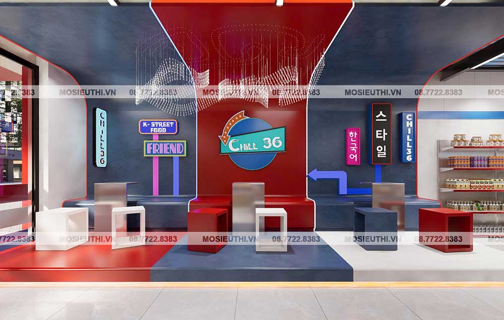 Với đặc thù mặt bằng cửa hàng tiện lợi, việc tận dụng không gian là yếu tố sống còn. Thiết kế 3D Chill 36 được xây dựng theo hướng: